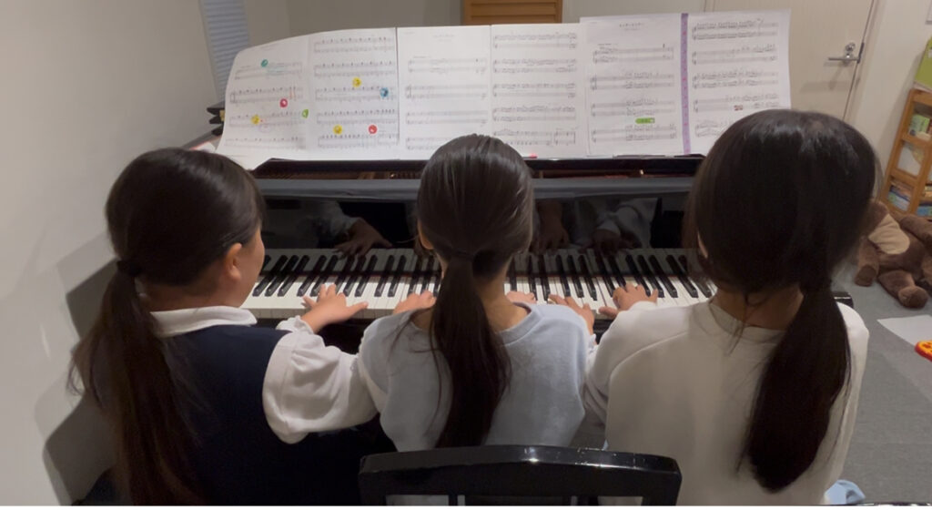 3人6手連弾を練習中の4年生の生徒さんたちです。